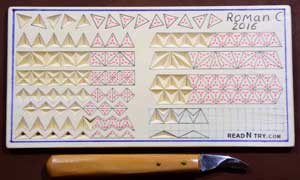 I think it is important to learn drawing the patterns manually and not always relying on the pattern transferring techniques. Acquiring the skill will help to experiment and to design unique one-of-a-kind master pieces. Here are some tips: draw a grid using a pencil and a ruler. Every cell in the grid should be a square with the side from 3/16” to 1/4” (4 – 6 mm). Connect some cell corners with other cell corners as you wish generally trying to get triangle shapes no bigger than 2-3 cells. Each triangle can be carved as a three corner chip. In general, smaller grid leads to smaller triangles/chips that are easier to carve.