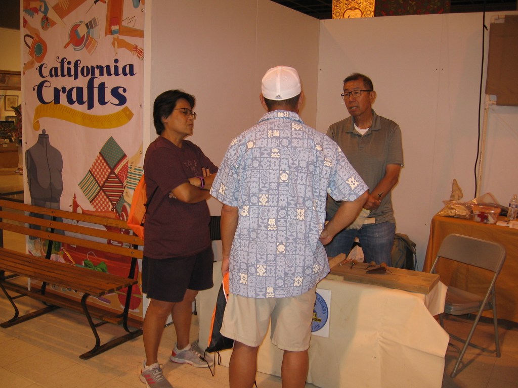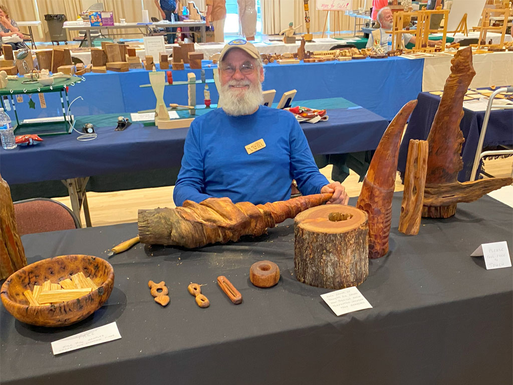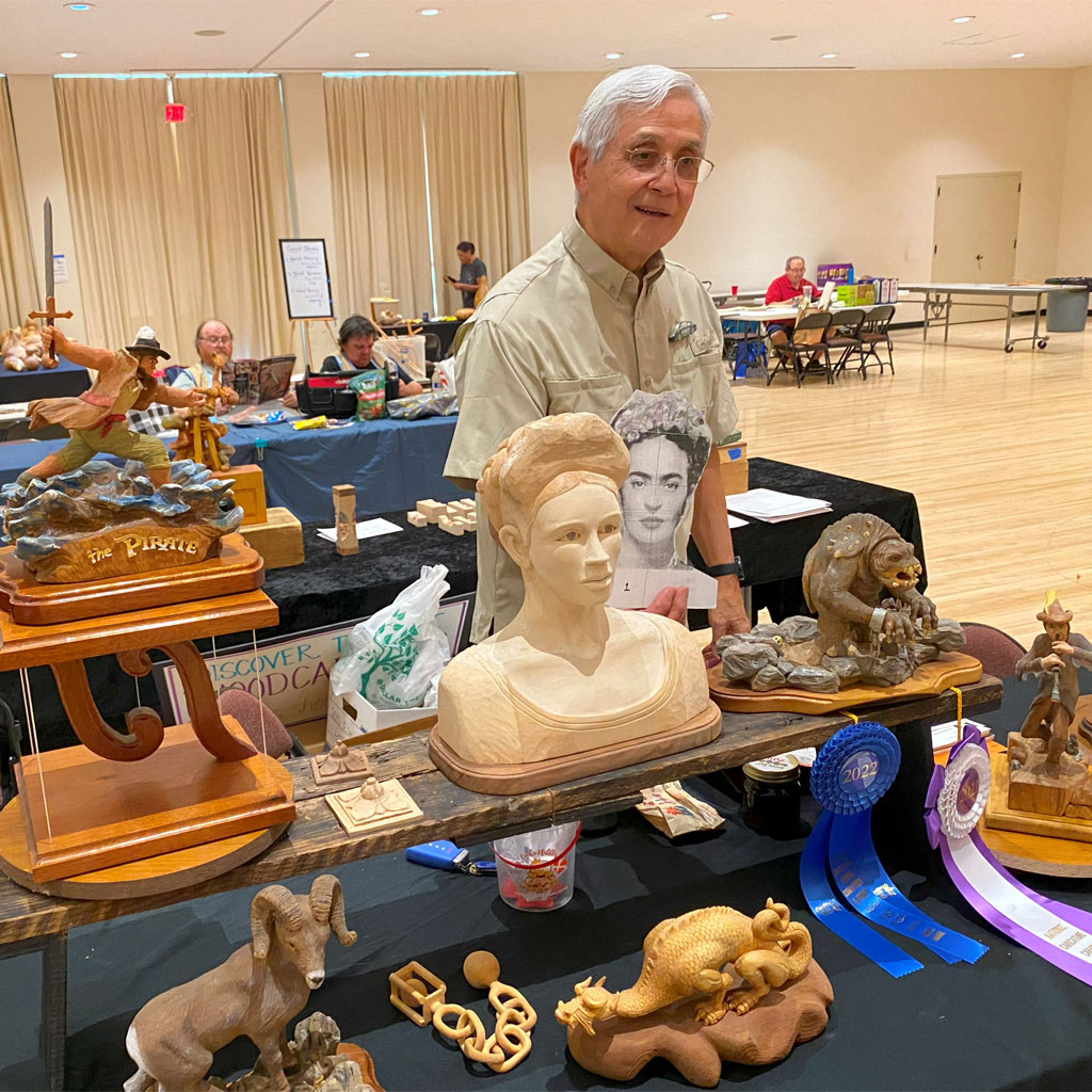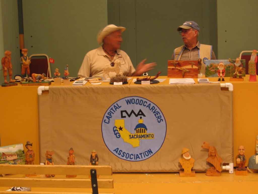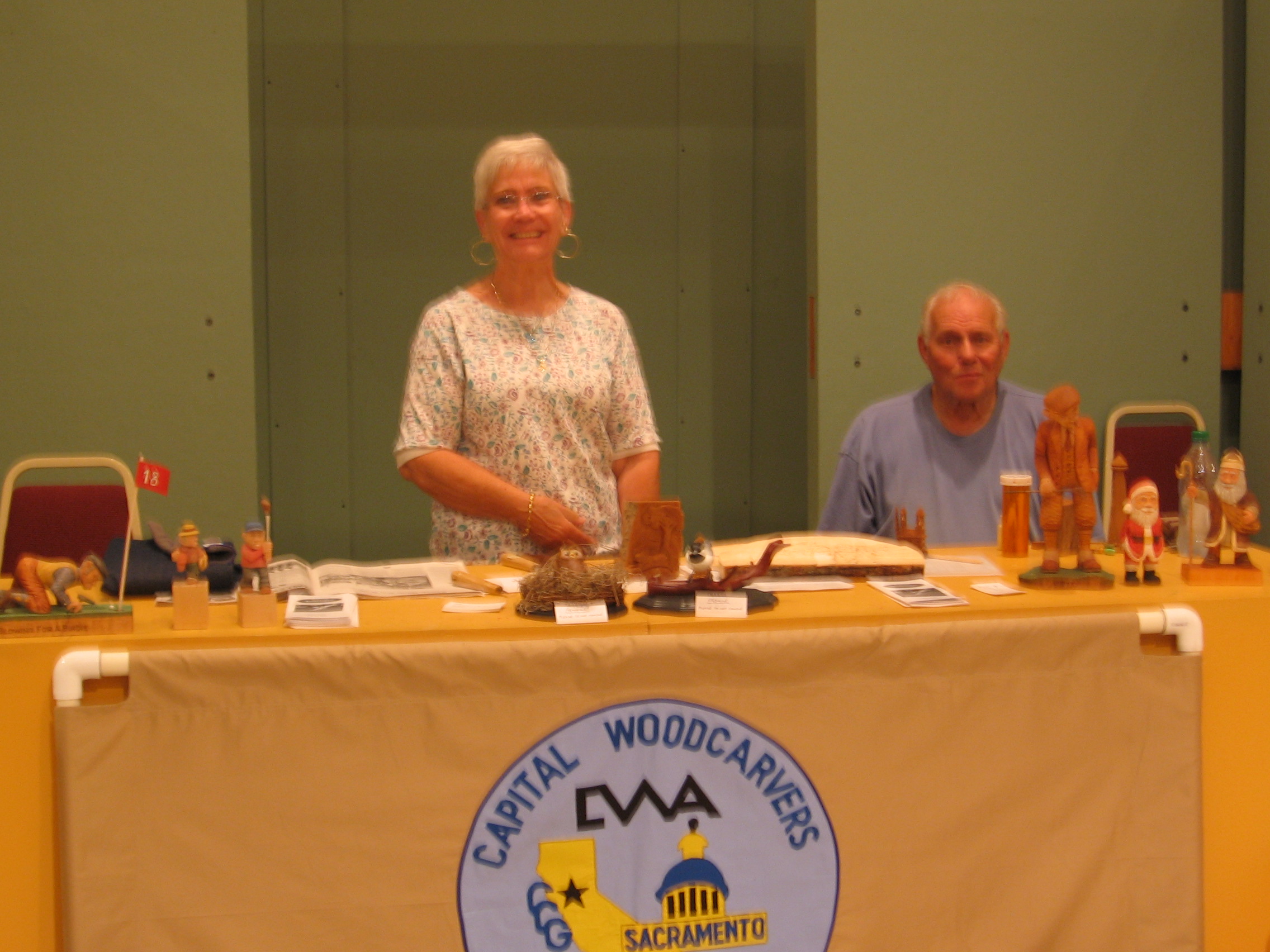 Shortly after it was decided to hold a State Fair in 2022, we were contacted to see if we wanted to demonstrate at the fair as we had in past years. We agreed to do so. Ed Santarosa served as the coordinator between the State Fair and the club. Andy Hiroshima, Joe You, Brad Dano, Leroy Stebner and Jim Veatch agreed to help with the demonstrations. Carol Santarosa was recruited to help with set up of the demonstration display and to man the booth as necessary. Demonstration days were Monday, July 25 and Tuesday, July 26 in Building 3, the California Crafts/Student Showcase building. We were assigned the demonstration area just inside the entry doors to the building so that anyone entering the building had to pass by our demonstration booth. As a result, we had many visitors to our booth, many questions about woodcarving in general and many questions about how to carve wood. We invited anyone interested in learning to carve to attend our meetings at Woodcraft. We distributed trifold brochures and quarter cards that had been updated by Alison Cook and formatted and printed by Judith Steinle. Photos for the documents were by Terry Hajek. Here are some photos from the fair. Thanks to all who volunteered to help! (reprinted from Sacramento Shavins’, CWA Newsletter, August, 2022