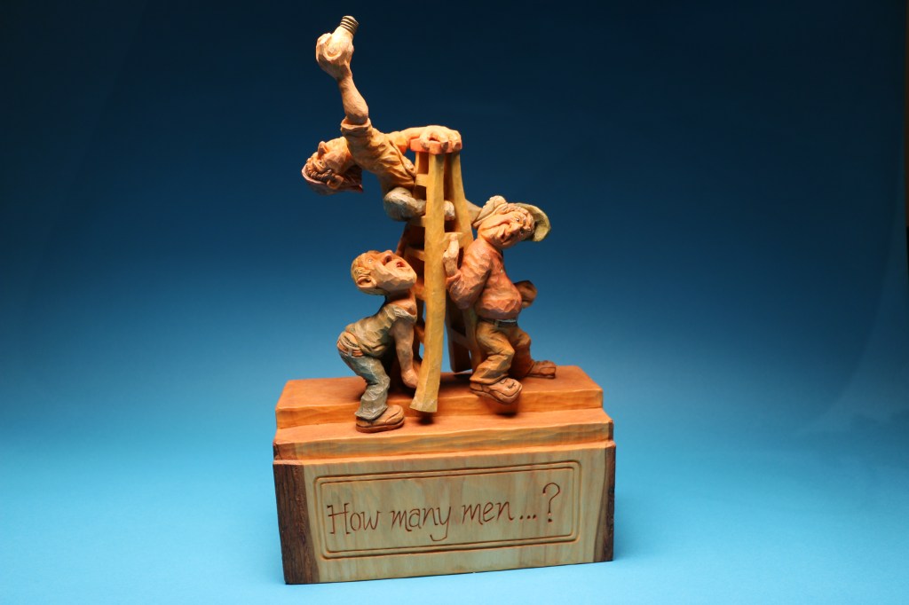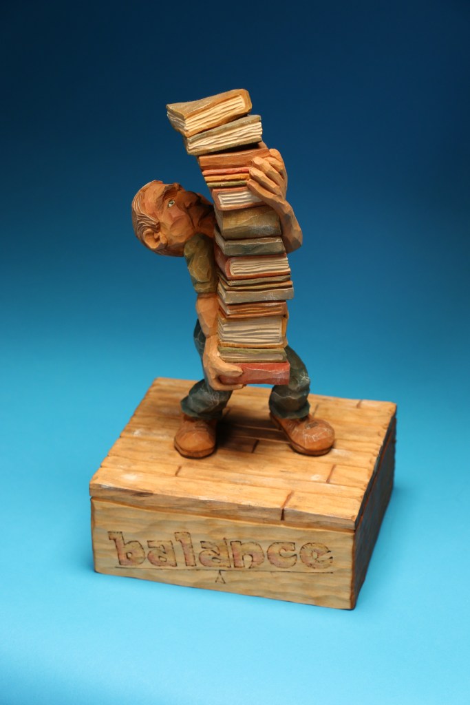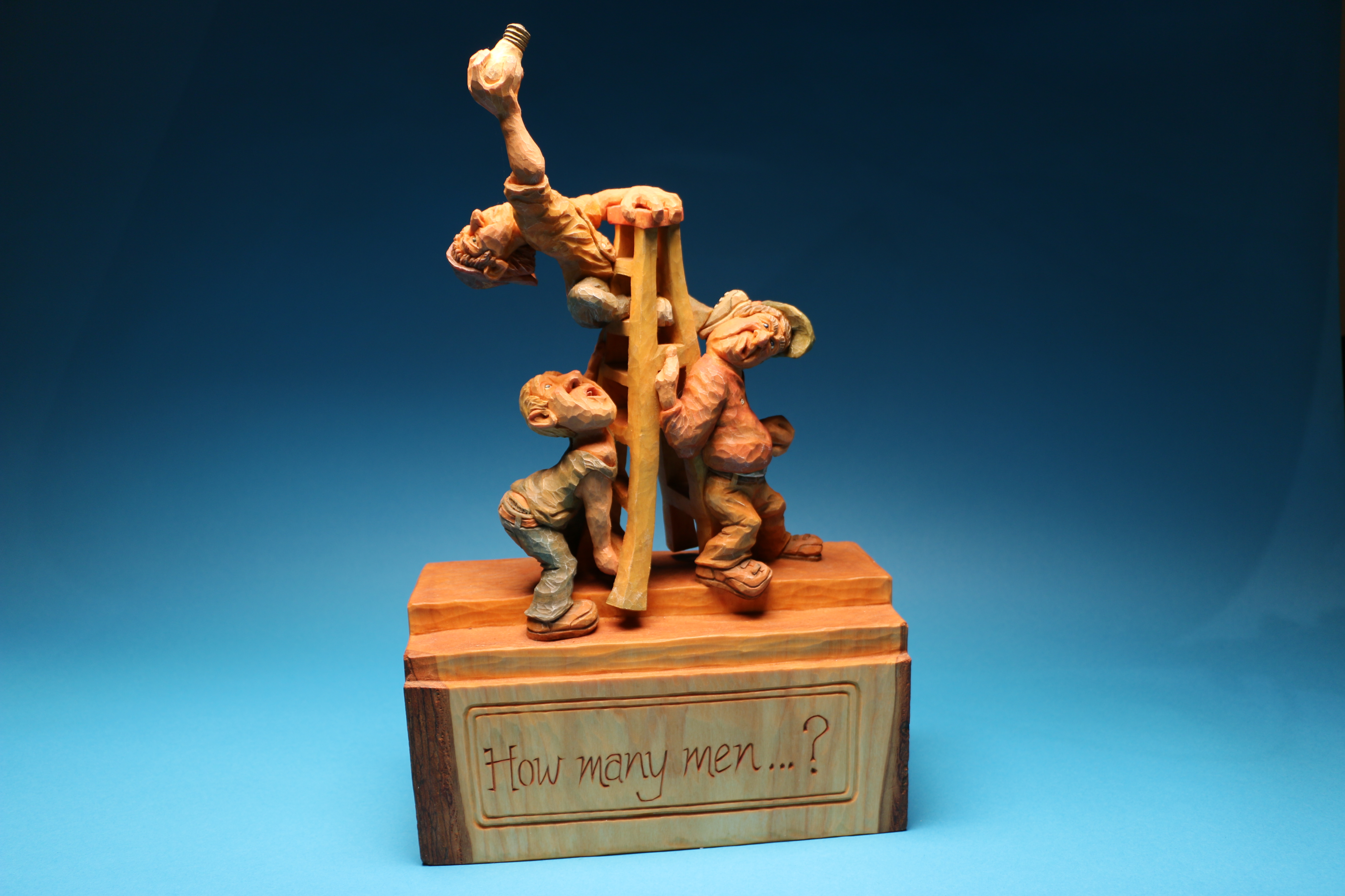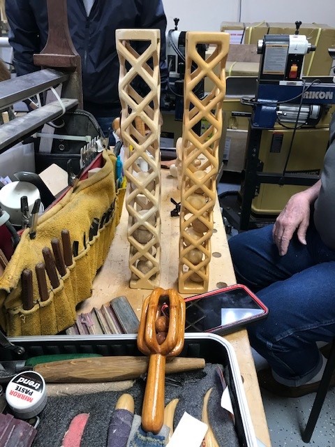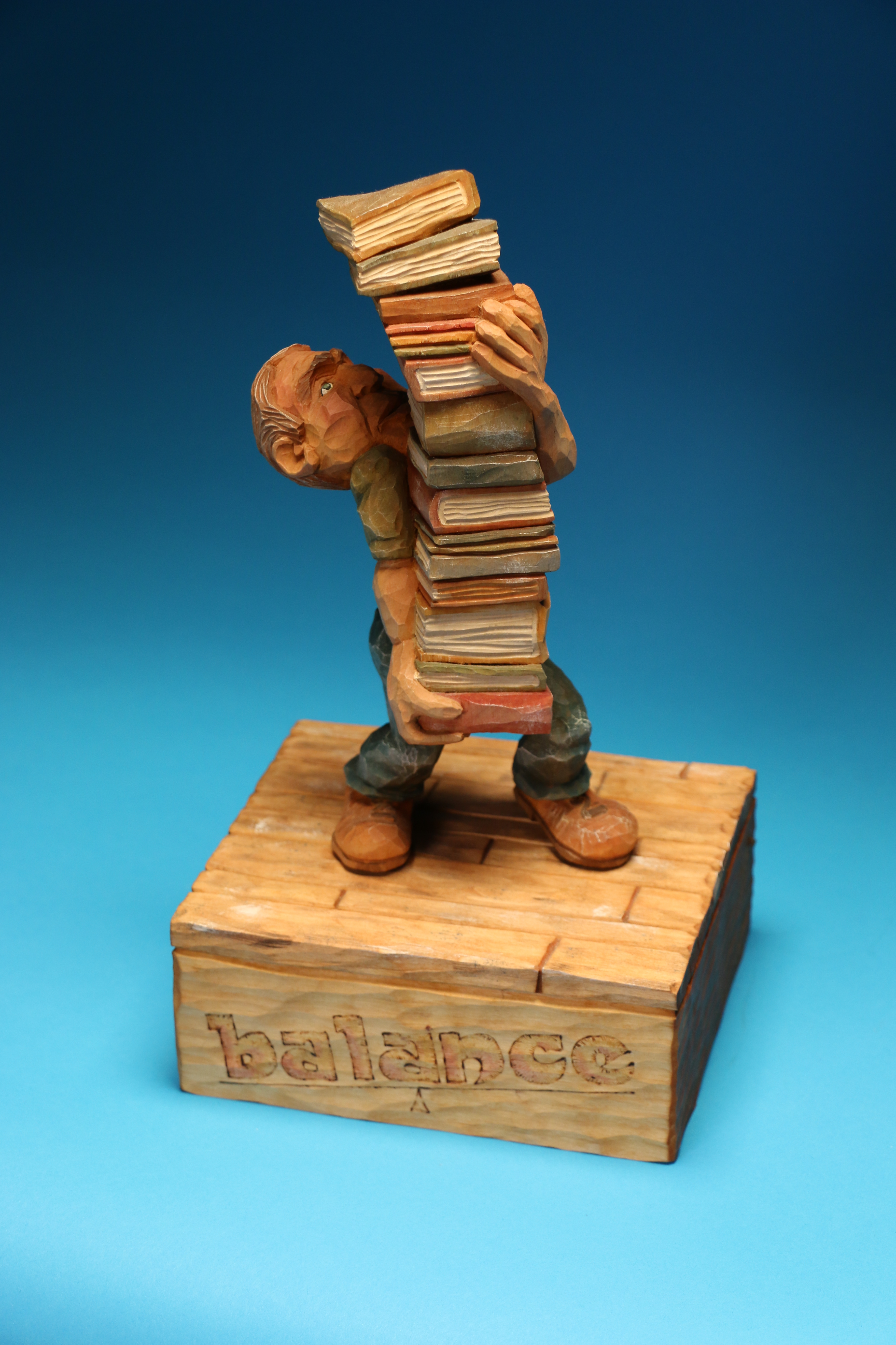 Joe has had some interesting experiences relating to his carving. CCA does various fund-raising events to support their organization. One of those was an on-line auction of carvings with each member providing one. Joe’s carving was purchased by a Canadian wood carver. Sometime later, Joe was in Canada and met the man who had bought his carving. Both men found it interesting to meet the person behind the name. Joe did a workshop in Stevens Point, Wisconsin. The members of the club there had obtained a design for one of Joe’s carvings and several had carved it. It was a great feeling for Joe to see the club members versions of his design and to have been copied by the local carvers. As Oscar Wilde noted, “Imitation is the sincerest form of flattery ….”. The carving that was copied is called “Balance” and is shown here.