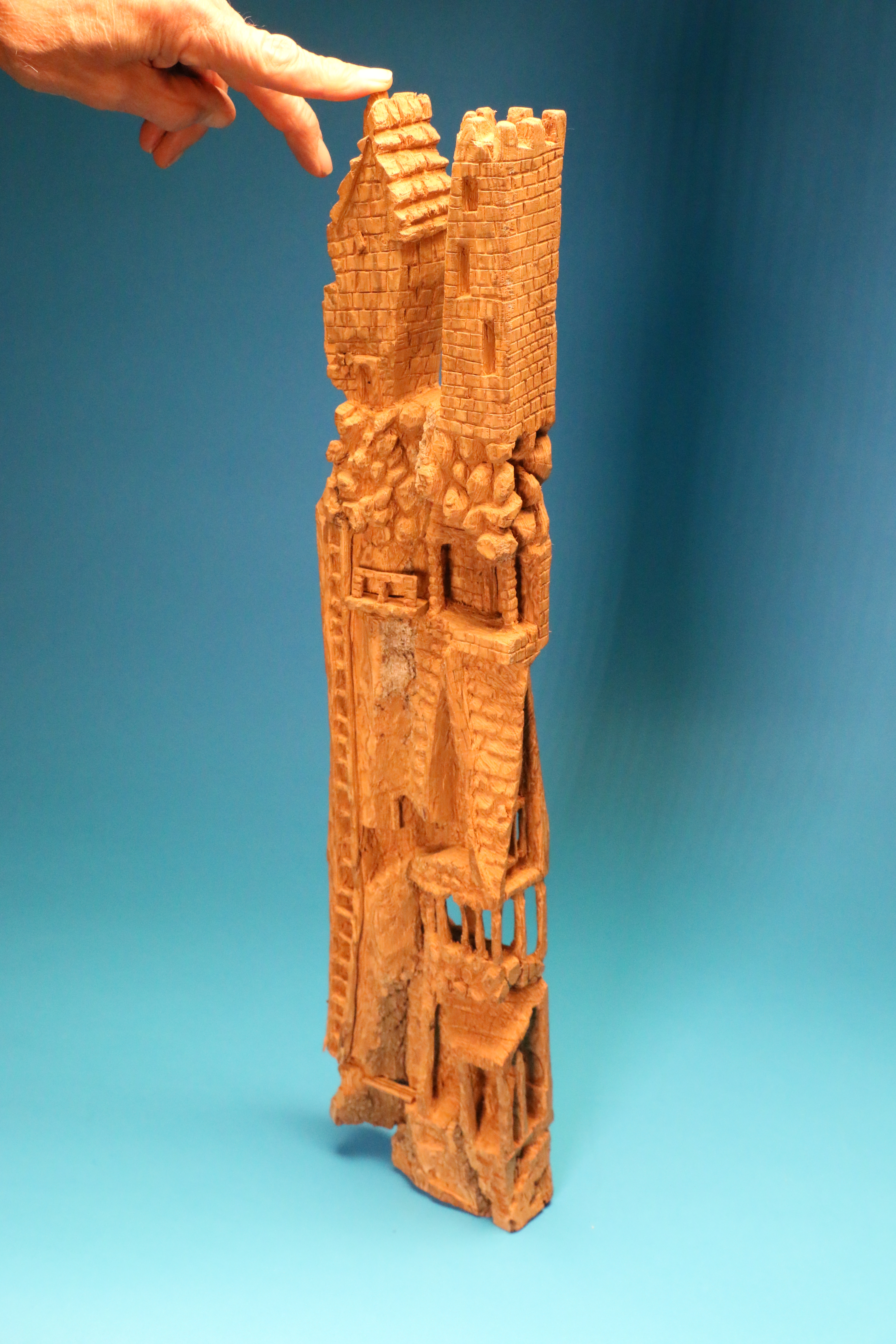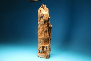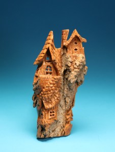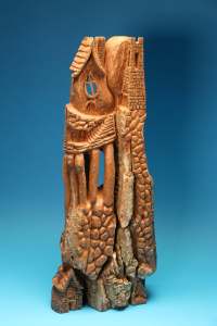 Bark Carving: Bark Carving is a mix of Relief Carving and Chip Carving on a piece of Bark. This type of carving is very free form and usually consists of many small cuts and chips to make up the complete carving picture. The two main types of bark carving are whimsical houses and wood spirits.