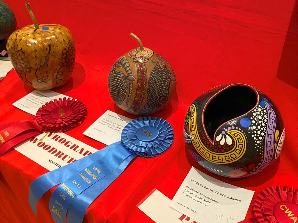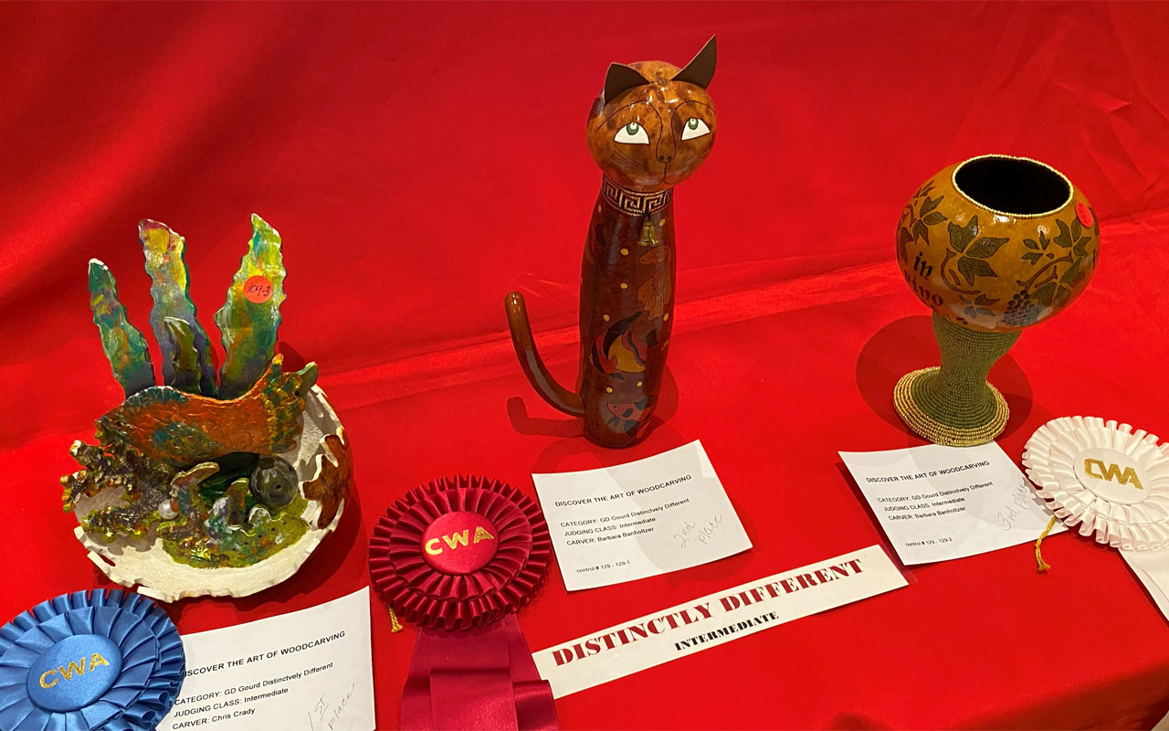 There are three wood carving levels: Novice, Advanced, and Expert, The gourd judging levels are Novice, Intermediate, Advanced and Master. The entrant chooses the level they feel they best fit into and then choose the category for the piece. Each piece is examined by show judges and may be awarded a blue, red, or white ribbon, based on the merit of the piece. All entries are on display during the show regardless of whether an award was given or not. All entries must remain on display until the end of the show at 4:00 p.m. on Sunday. The following special awards for both wood carving and gourds are also presented, some with cash awards: 1st Best of Show, 2nd Best of Show, 3rd Best of Show, People’s Choice,