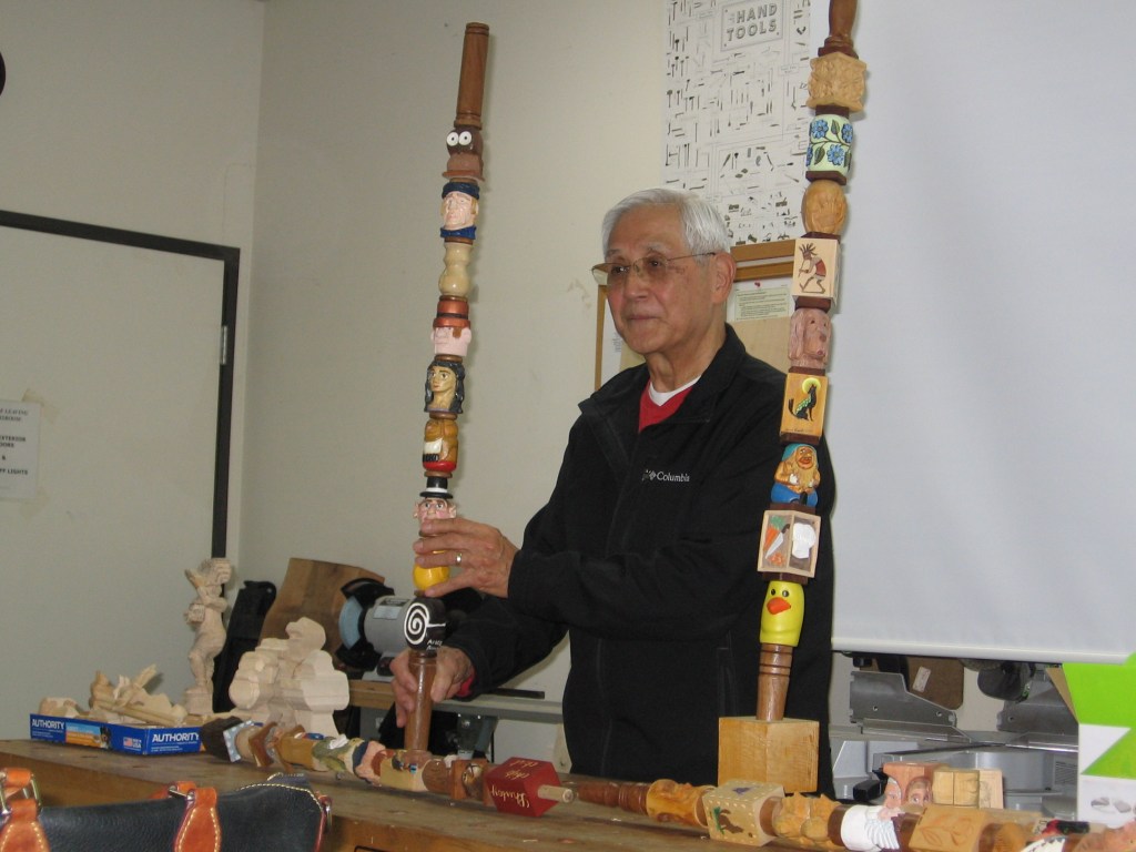 Featured CWA carver Andy Hiroshima. Andy was born to Dr. William and Ruth Hiroshima in a Japanese Relocation Camp in Hunt Idaho, near Twin Falls. He was the youngest of five, four brothers and one sister, and just six months old when the family was released from the camp. His parents were living in Sacramento. Andy’s father was a physician and chiropractor in when the internment began. Everything was taken from the family. When they were released from the camp, his father restarted his medical practice n LA. The family faced significant bias and discrimination as they tried to carry on a normal life. In order to buy a home in a nice neighborhood in LA his father had to have a non-Japanese friend purchase it for him. Andy met his future wife Lily while in high school. After dating for seven years, they were married and celebrated their 53rd anniversary this year. They have two sons and five grandchildren.
