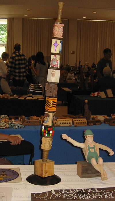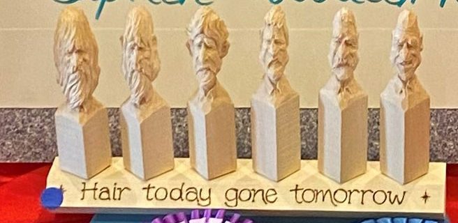 The big winners in the wood carving competition were Joe You, Best of Show with his clever set of six bearded faces with each one in the series having less facial hair, making the choice of title for the piece inevitable: “Hair Today Gone Tomorrow”. The terrible pun, notwithstanding, the faces, which are Joe’s Specialty, were engaging and brought a smile to the observers in the crowd.