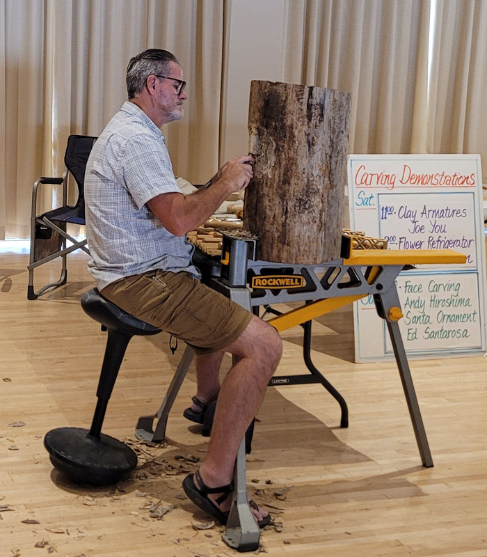 CWA member Joe You demonstrates how to carve a face for a caricature.