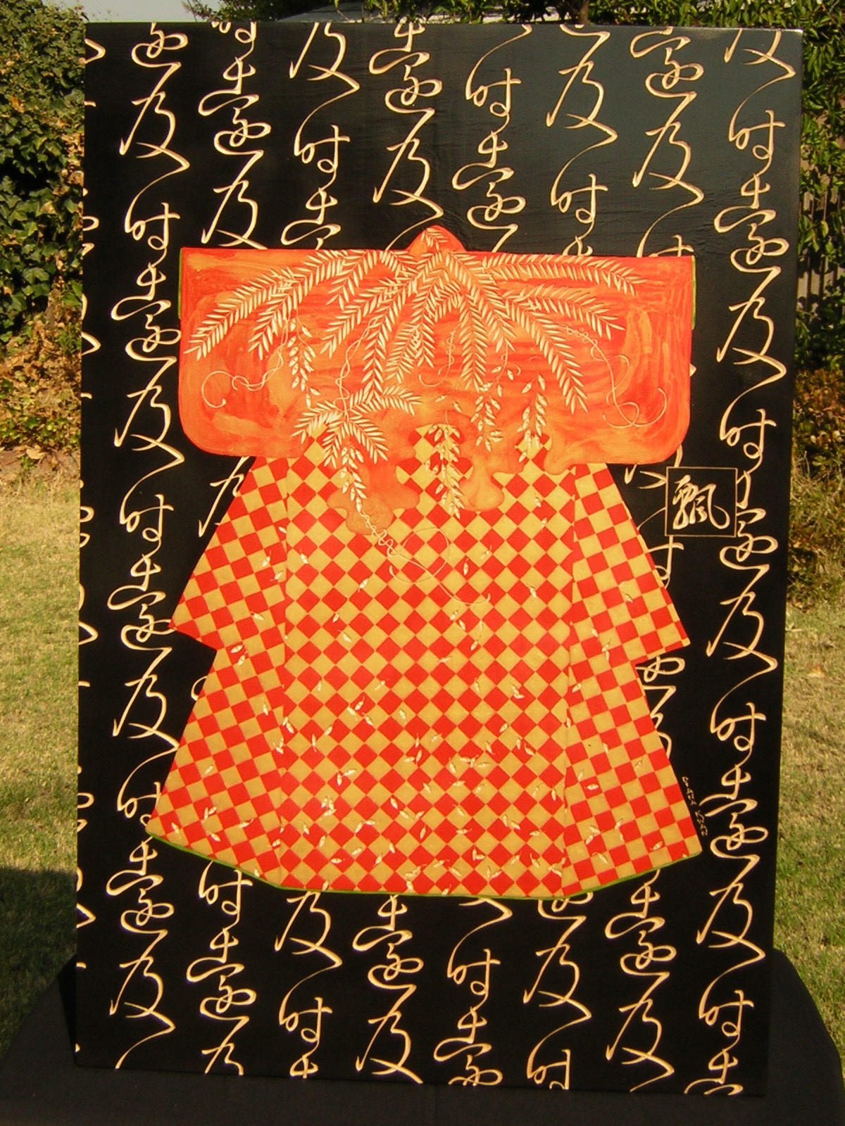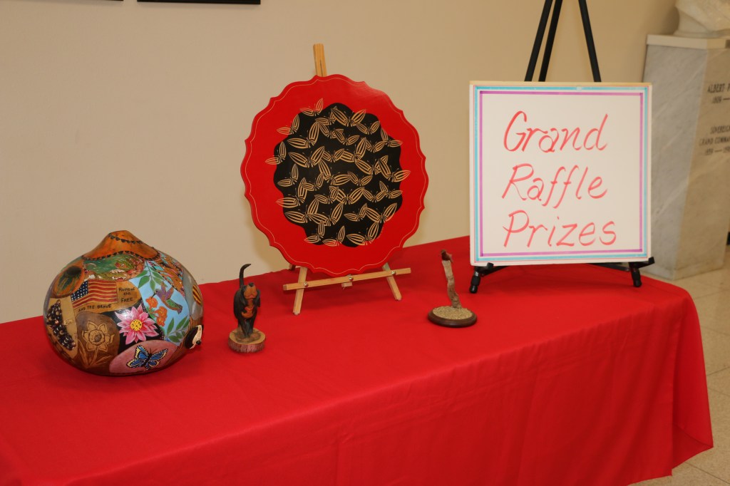 The raffle prizes included a colorfully decorated gourd and a beautiful chip carving.