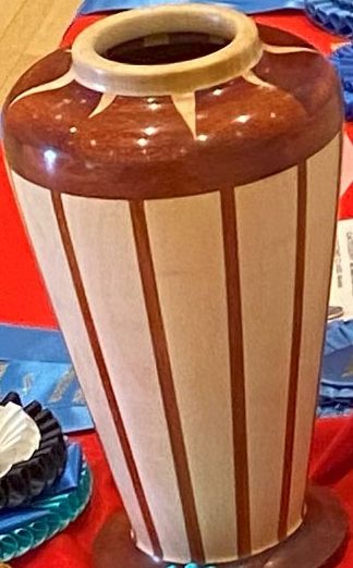 Brad Dano won Third Best of Show with a beautiful 15-inch-tall vase with staved-type construction of maple and padauk wood. The top was maple segmented with a compass inlay. Brad recounted that this vase evolved as he worked on it, resulting in this striking finished piece.