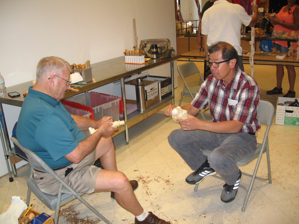 Joe You and Nelson Krouse discussing the finer points of caricature carving.