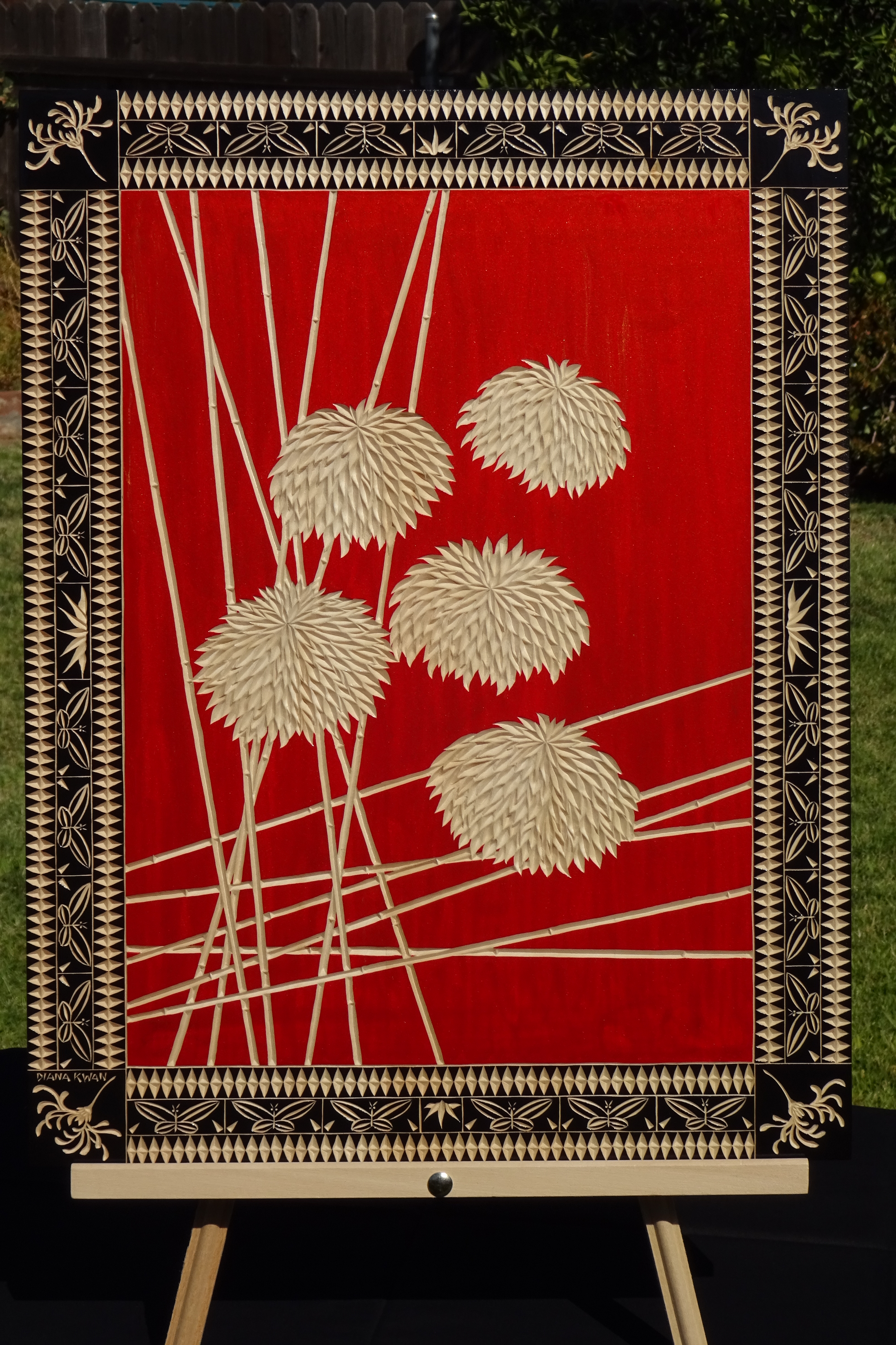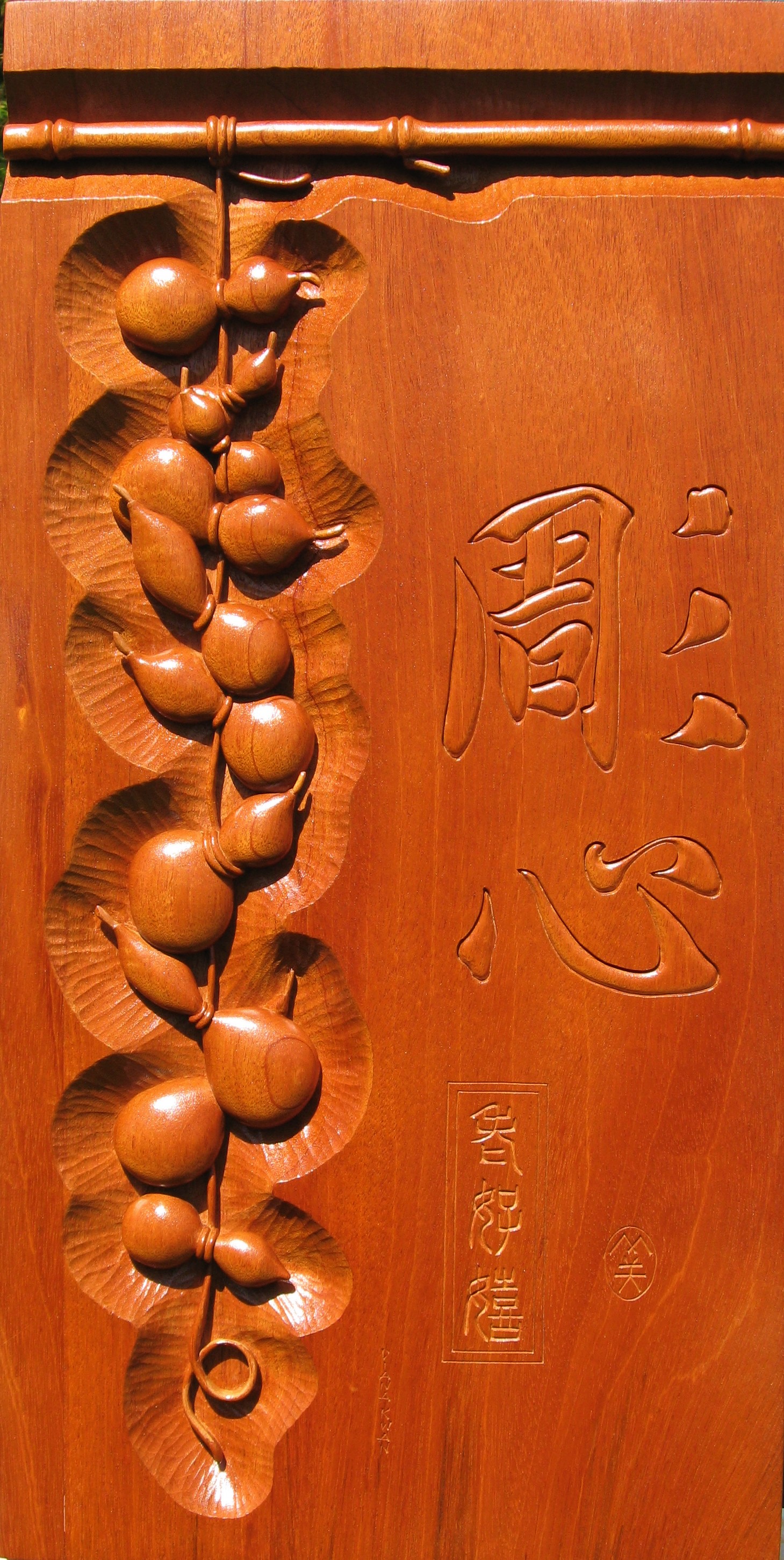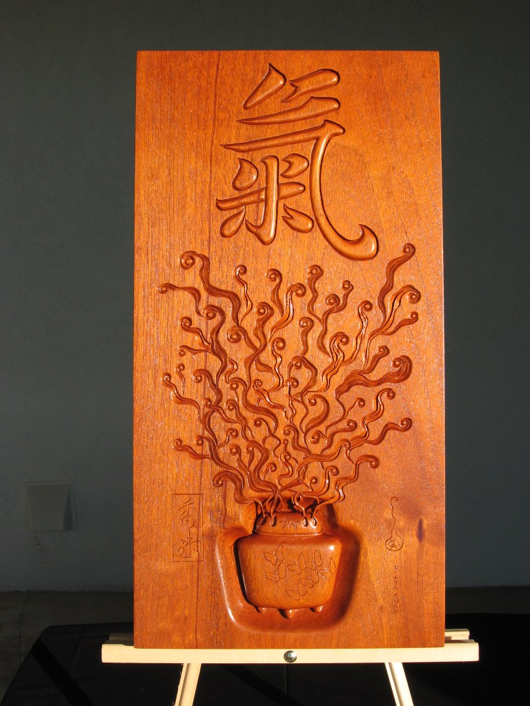 Featured CWA carver Diana Kwan: Born in Shanghai, raised in Hong Kong, Diana came to featuring Asian themes in her carvings naturally. In addition to Chinese, Japanese and Korean themes, she has been influenced by Native American, African and European touches through the years. Diana says,” I am open to many ideas”, Her work reflect that perspective, If you have seen her beautiful carvings (if you haven’t you should) you will know that she combines relief and chip carving. While that is somewhat unique, her real claim to fame is the inclusion of color in her pieces. That has turned her carvings into works of art that have been featured in high end art shows and have brought her international recognition and many commissions for elaborate pieces in homes and at the State Capitol building. This recognition and fame did not come easily, it was the result of years of hard work and dedication to excellence.