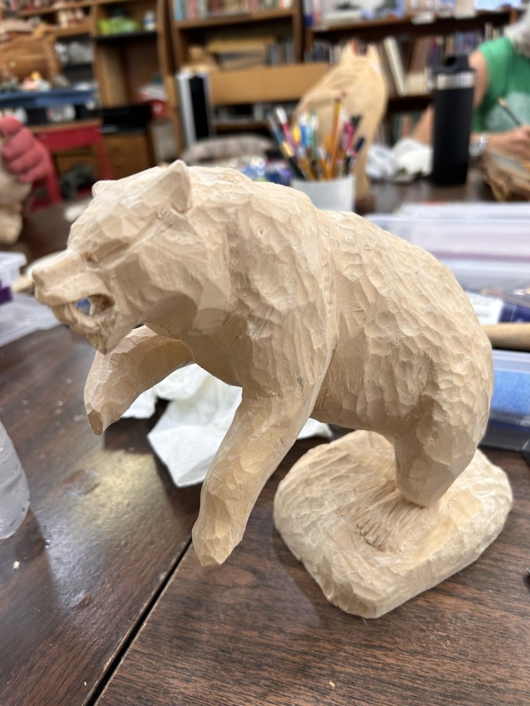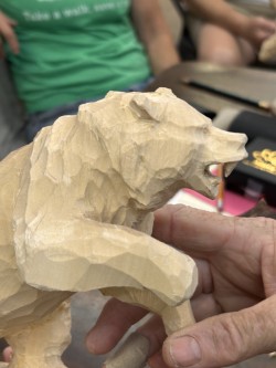 Like many instructors, Janet focused on sharp tools as the most important parameter in making a good carving. She dealt with varying skill levels of participants though a combination of group instruction and individual attention. Students found that she was very patient but didn’t “baby” the students. She gave lots of feedback. She was critical, but kind in her comments. Janet handled multiple skill levels and people working on several different projects well. Her sense of humor was also evident when she quipped, “I know a lot about bears, but I don’t ever want to see one.” When one of the participants broke the protruding front teeth off her bear, the comment was, “carve a fish and put it in the mouth”.